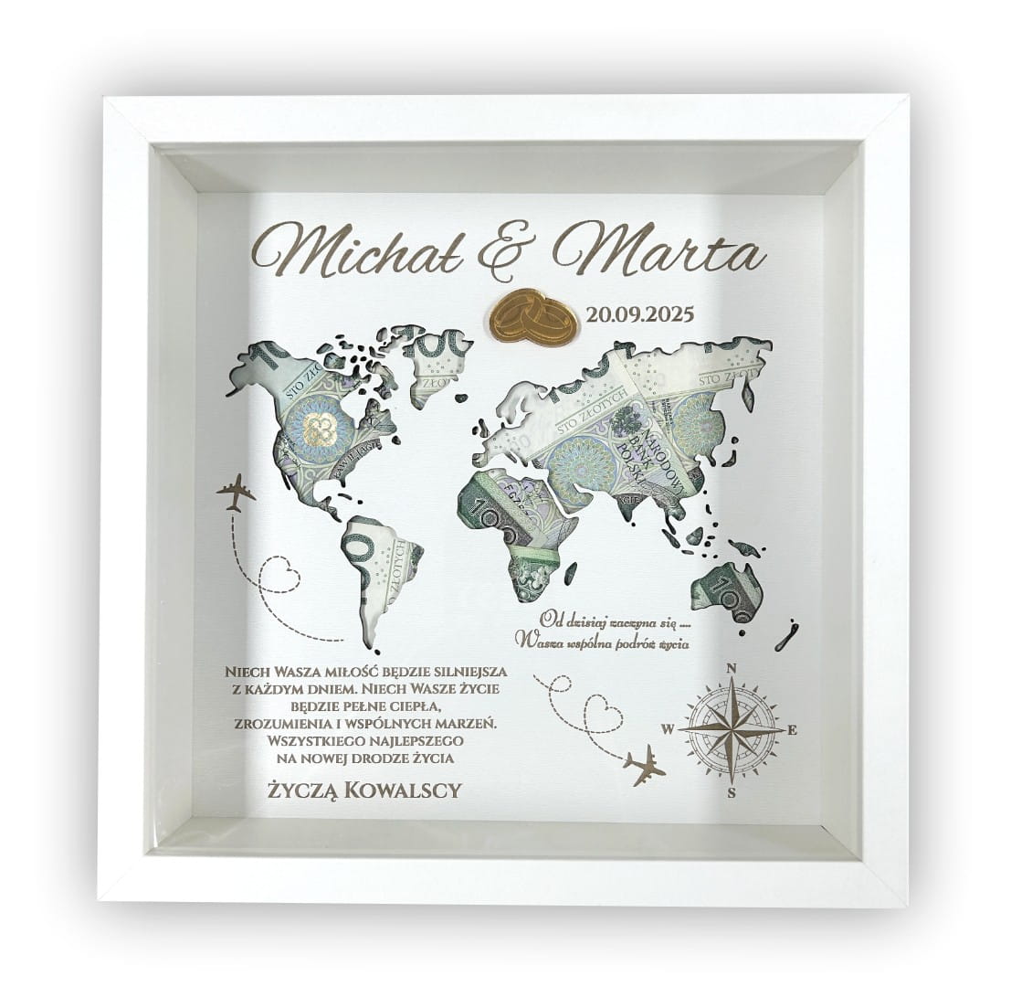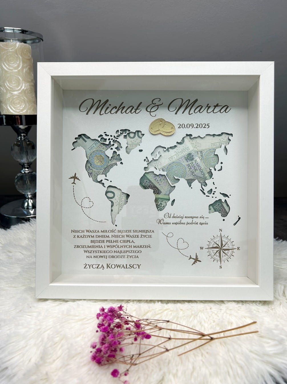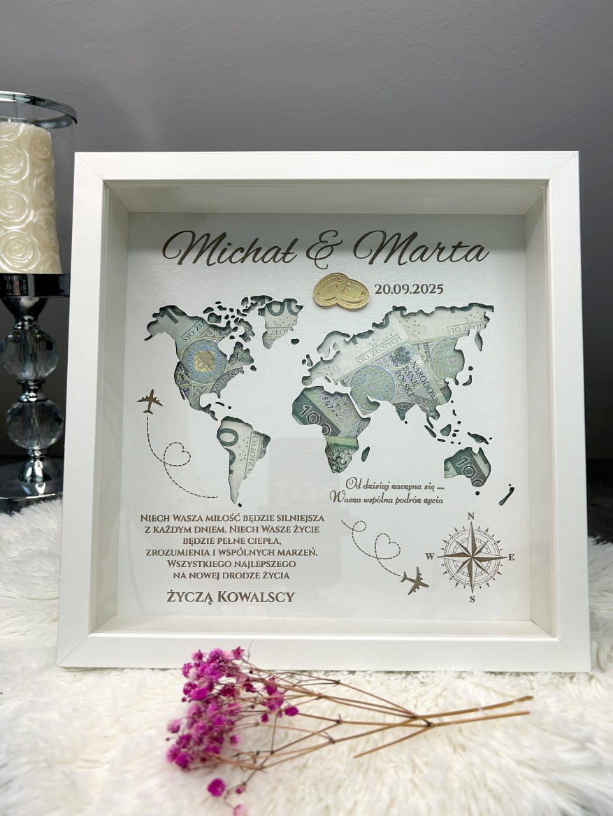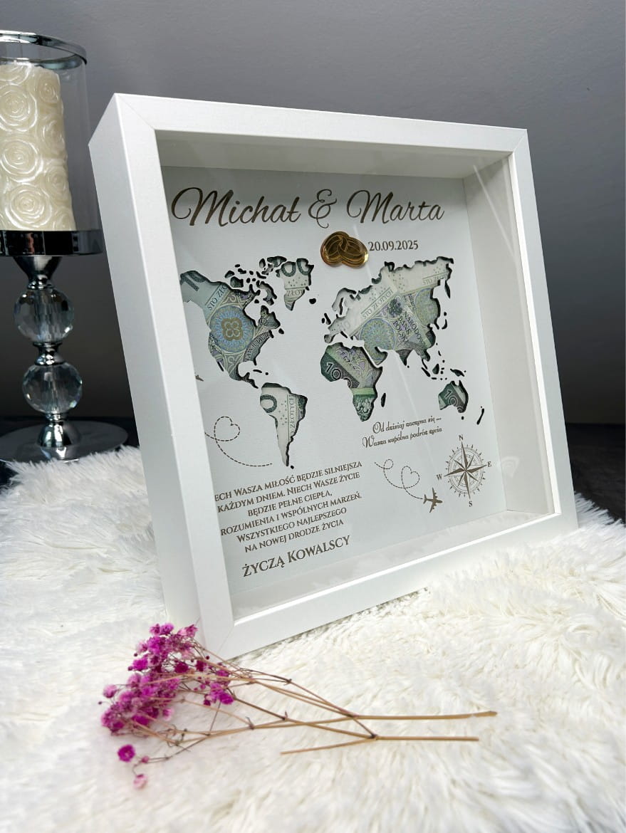 Ta elegancka ramka, ozdobiona starannie wyciętą mapą świata, stanowi nie tylko efektowną dekorację, ale także praktyczne miejsce na umieszczenie pieniędzy – idealnego prezentu na nową drogę życia. Wewnątrz ramki znajdziesz piękne życzenia oraz imiona pary młodej, co sprawia, że jest to bardzo osobisty i sentymentalny upominek.