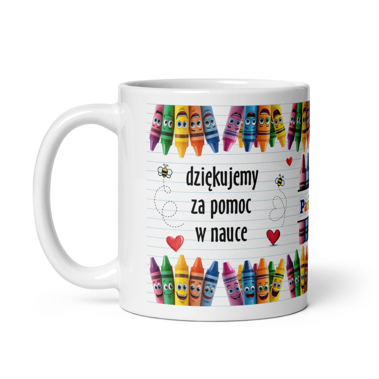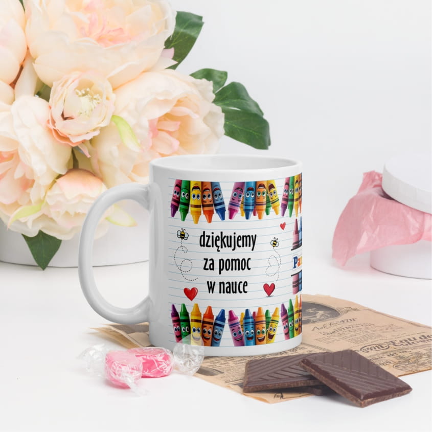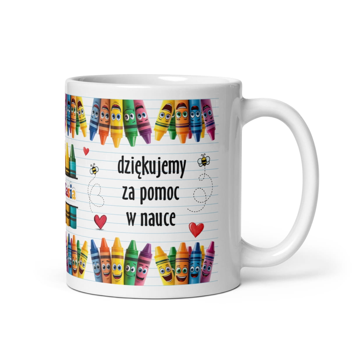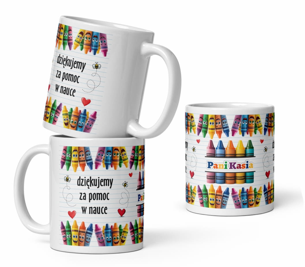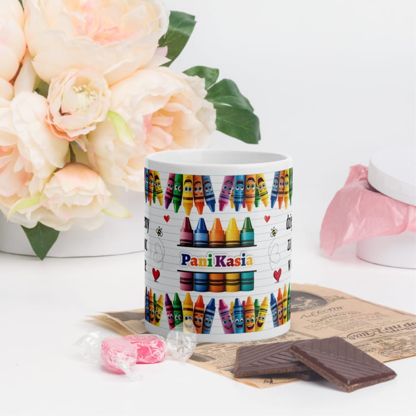 Biały kubek jako podziękowanie dla nauczyciela z grafiką kredek świecowych