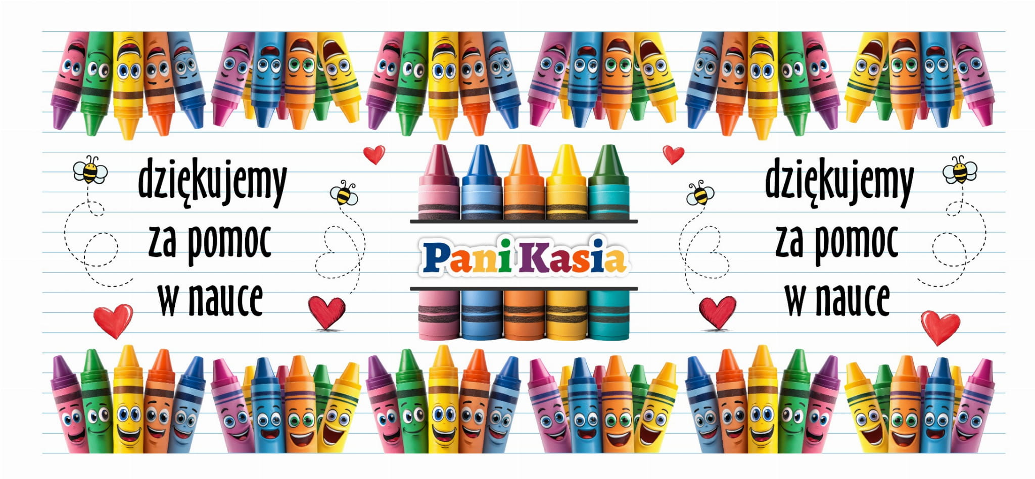 Kubek ozdobiony jest kolorową grafiką kredek świecowych, symbolizujących kreatywność i radość nauki. Na środku znajduje się miejsce na imię nauczyciela, co czyni ten upominek jeszcze bardziej osobistym i unikalnym.