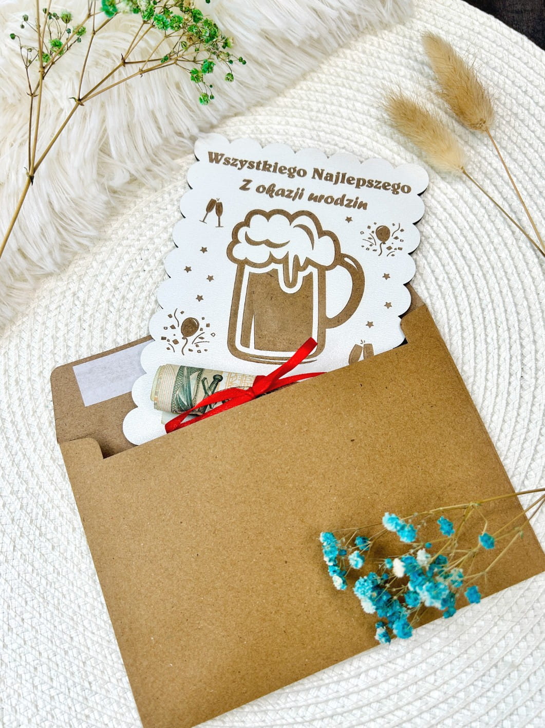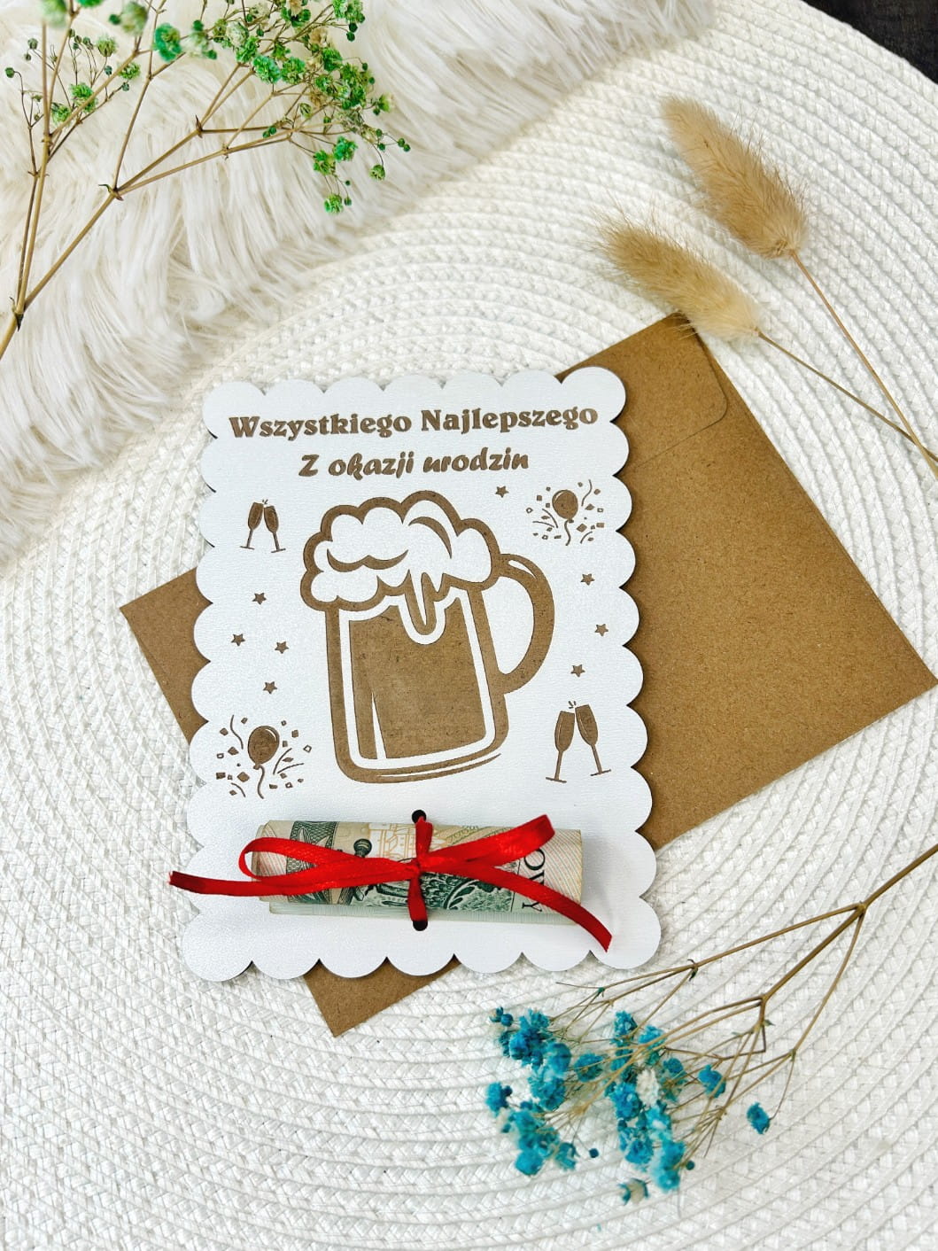 W zestawie: Drewniana karta, czerwona wstążka, koperta kraft. (Uwaga: Banknot widoczny na zdjęciu nie jest częścią zestawu).