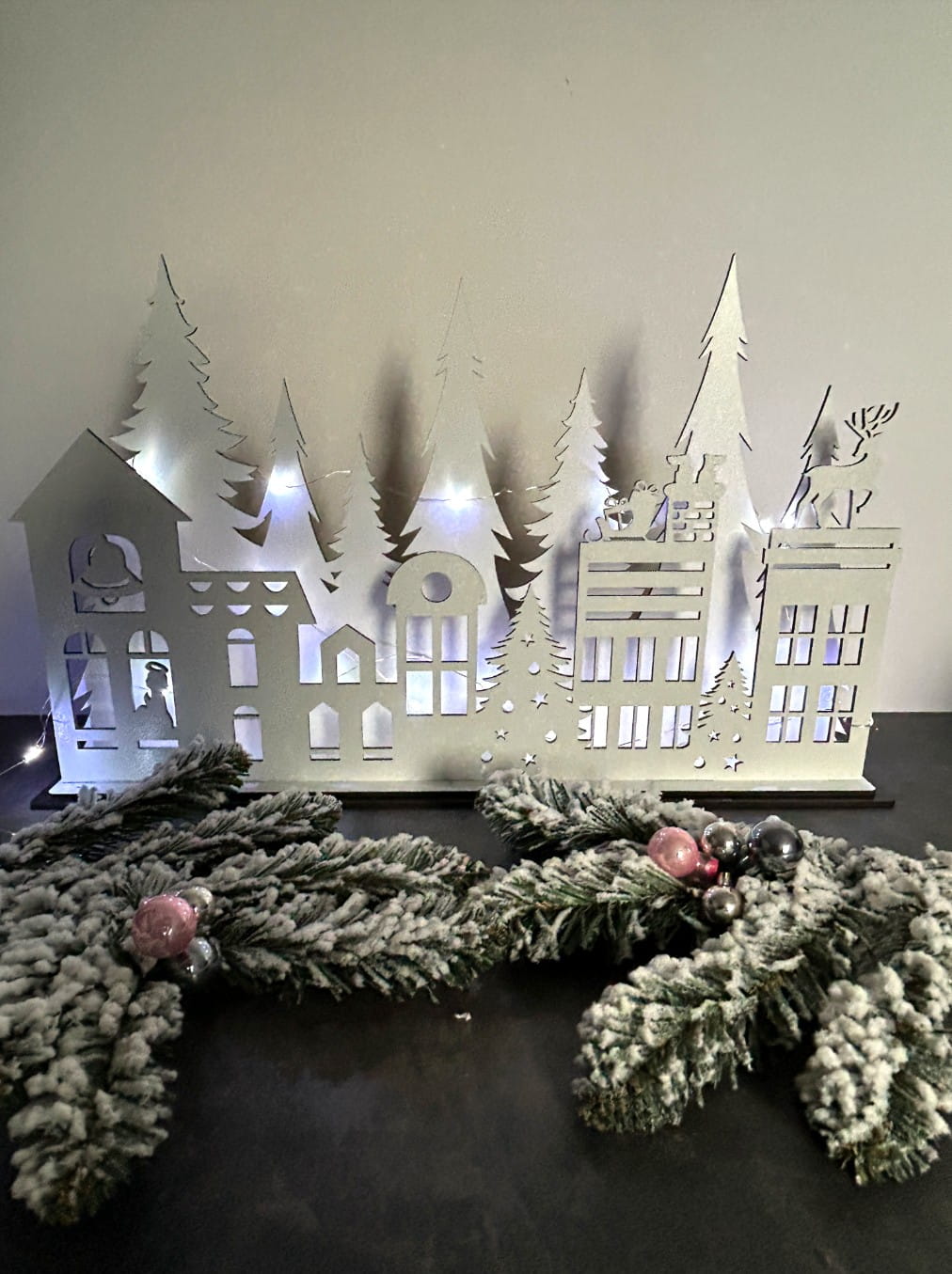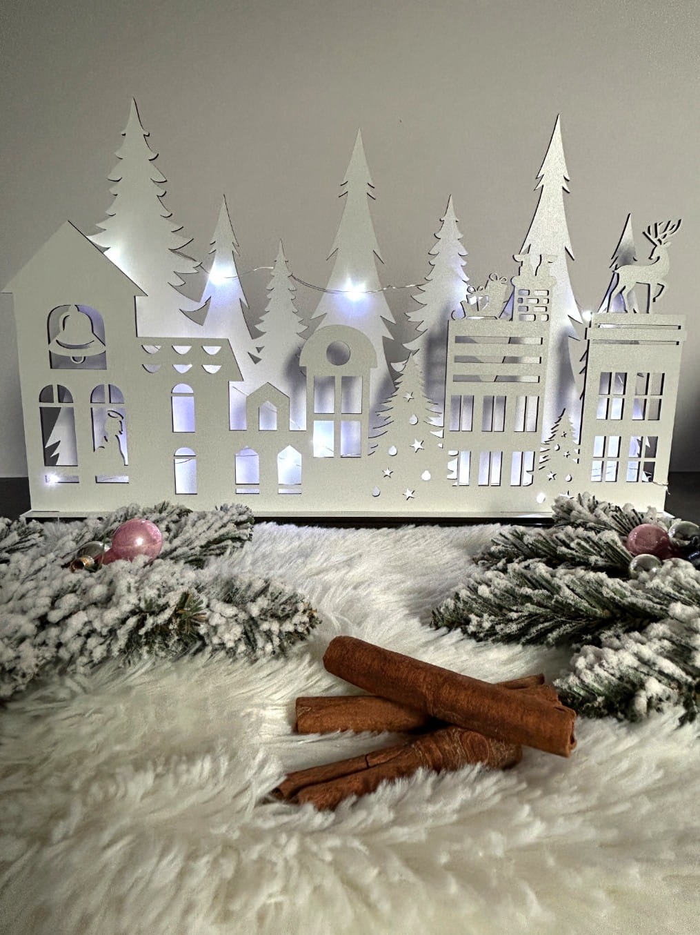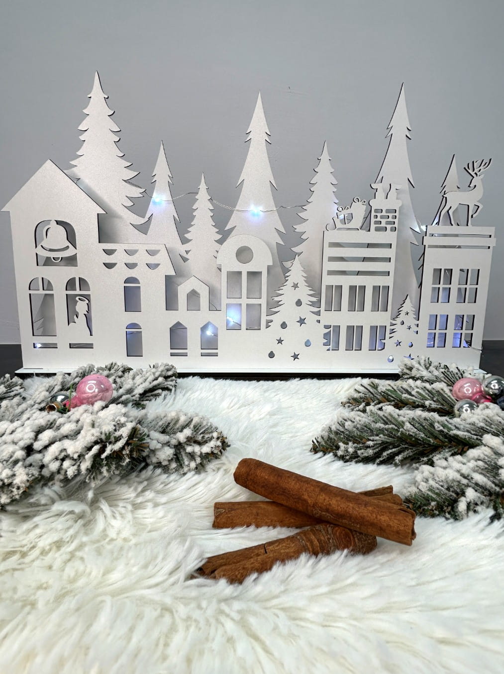 Ten efektowny domek wykonany jest z białej płyty i umieszczony na podwójnej podstawce, co nadaje mu stabilność oraz elegancję. Jego dwa poziomy oferują piękne wizualne doznania – na pierwszej ścianie możesz dostrzec urokliwe kamieniczki, przedstawiające Mikołaja wchodzącego do komina, a także renifera oraz aniołka, którzy dodają całości magicznego klimatu. Druga ściana urzeka widokiem lasu pełnego choinek, które wprowadzą do Twojego wnętrza prawdziwie świąteczną atmosferę.
