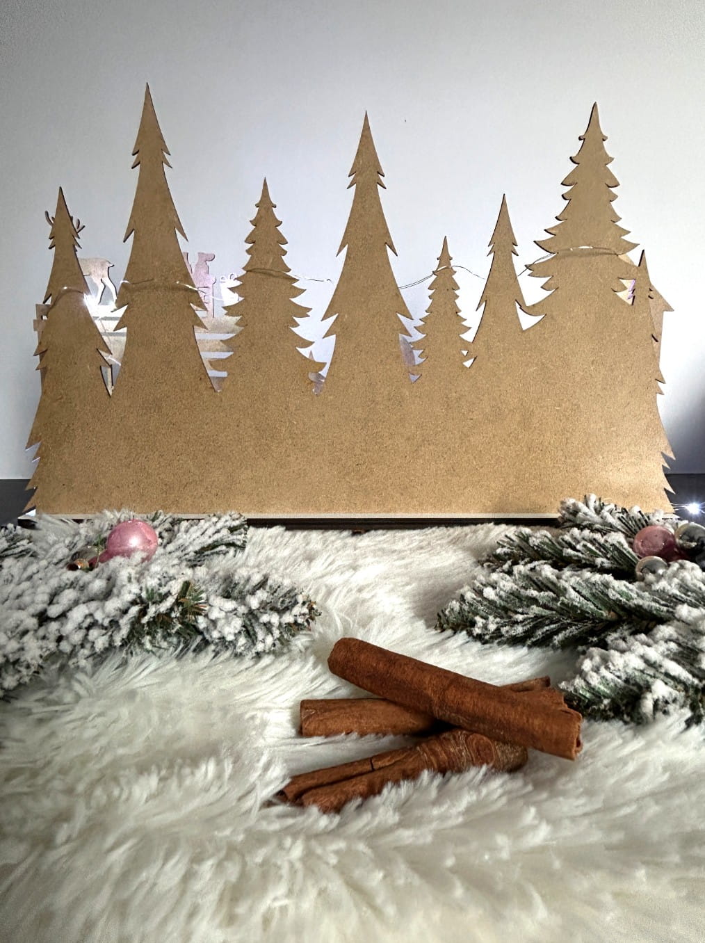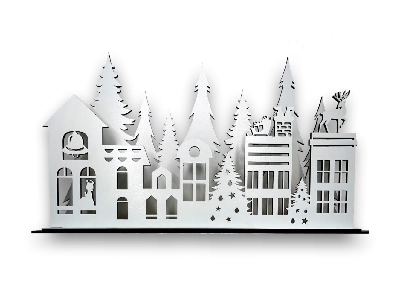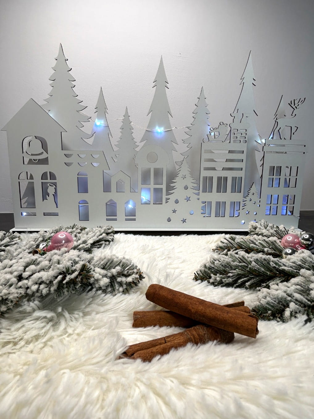 Ten efektowny domek wykonany jest z białej płyty i umieszczony na podwójnej podstawce, co nadaje mu stabilność oraz elegancję. Jego dwa poziomy oferują piękne wizualne doznania – na pierwszej ścianie możesz dostrzec urokliwe kamieniczki, przedstawiające Mikołaja wchodzącego do komina, a także renifera oraz aniołka, którzy dodają całości magicznego klimatu. Druga ściana urzeka widokiem lasu pełnego choinek, które wprowadzą do Twojego wnętrza prawdziwie świąteczną atmosferę.