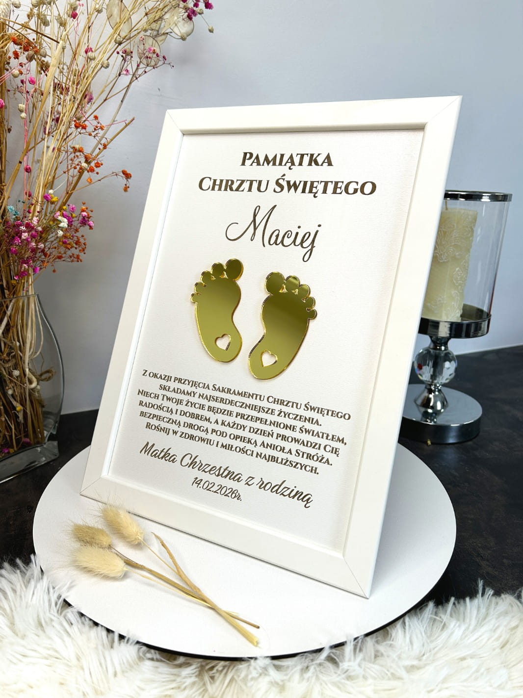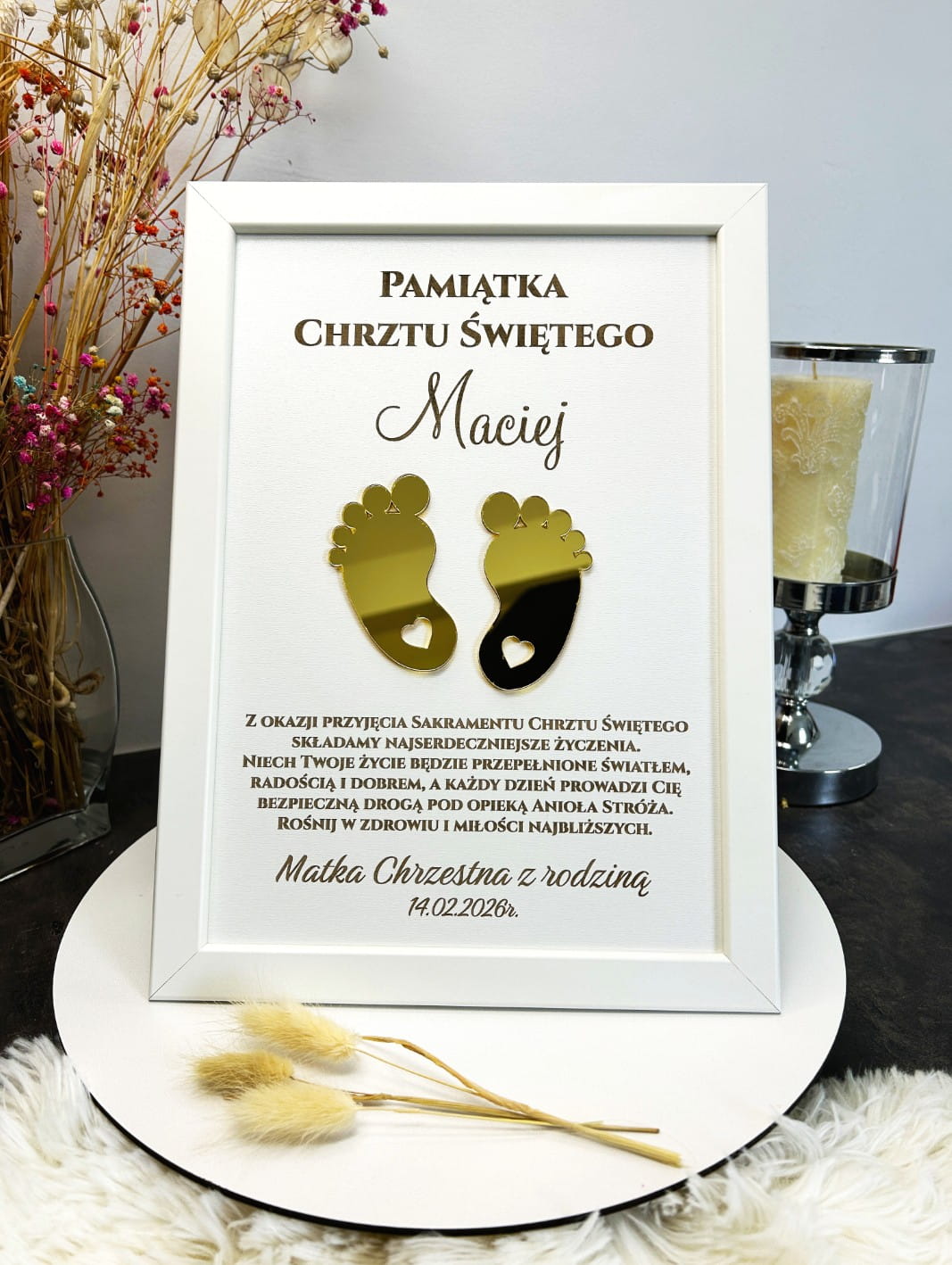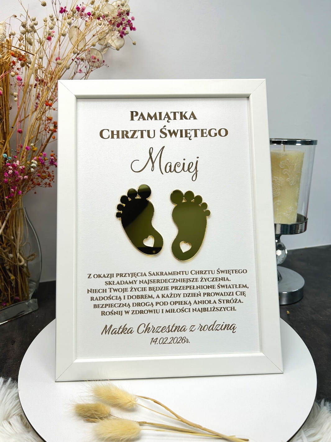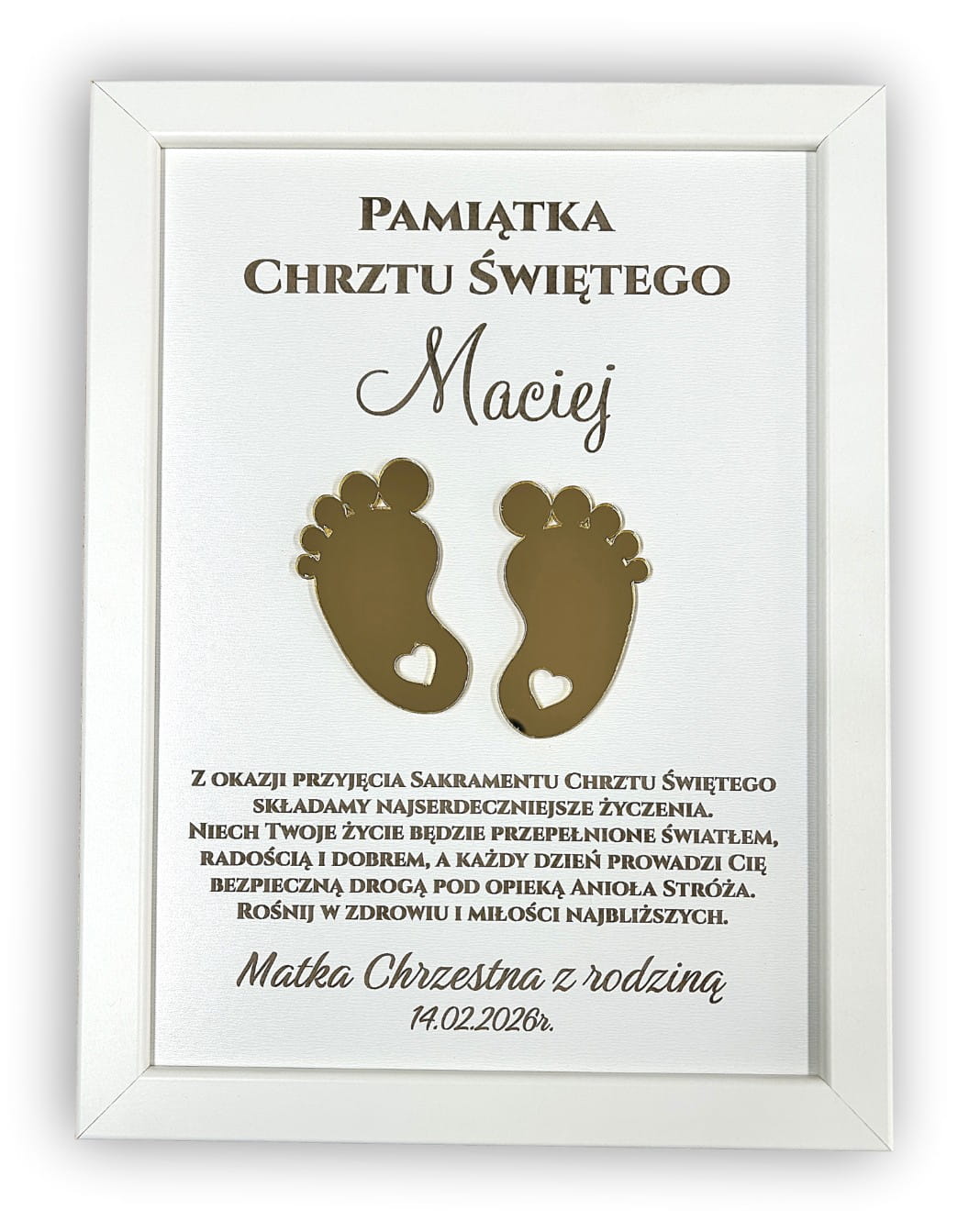 Sercem ramki są wyjątkowe, złote stópki o lustrzanym wykończeniu, które nadają całości trójwymiarowego efektu i luksusowego charakteru. Na teksturowanym, białym tle umieściliśmy imię dziecka oraz pełne ciepła życzenia, które będą codziennym przypomnieniem o miłości najbliższych.