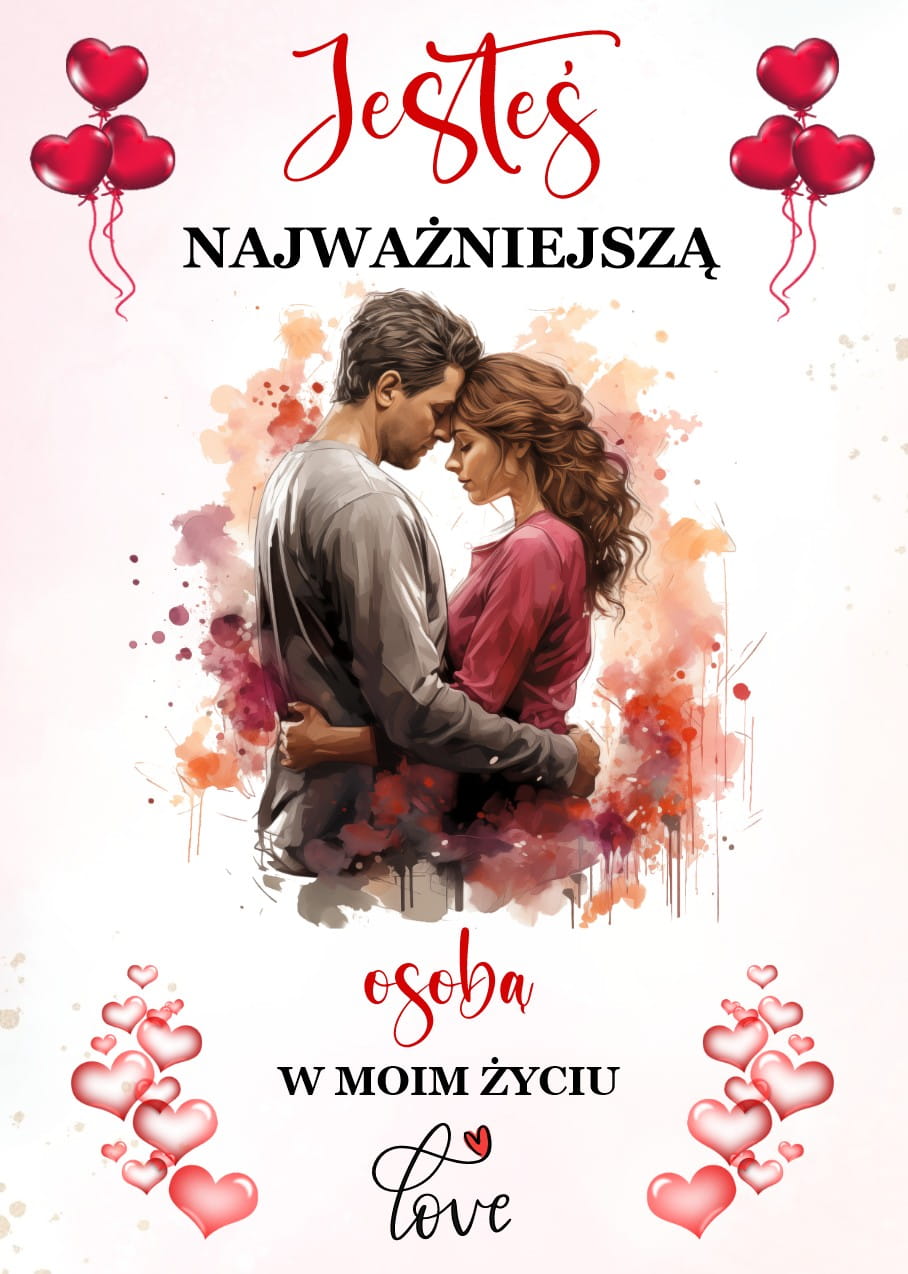 Szukasz sposobu, by powiedzieć „kocham” w nieszablonowy sposób? Ta wyjątkowa ramka to połączenie nowoczesnego designu z głębokim, emocjonalnym przekazem. Centralnym punktem grafiki jest subtelna, akwarelowa ilustracja pary w czułym objęciu, otoczona dynamicznymi plamami koloru i romantycznymi detalami.
