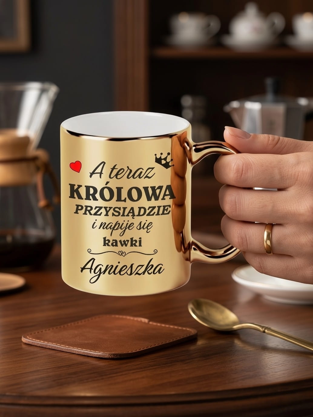 Szukasz idealnego prezentu, który połączy elegancję z odrobiną humoru i osobistym akcentem? Nasz złoty, lustrzany kubek z personalizacją to strzał w dziesiątkę. Napis "A teraz Królowa przysiądzie i napije się kawki" wraz z wybranym imieniem sprawi, że każda chwila z ulubionym napojem stanie się wyjątkowa.