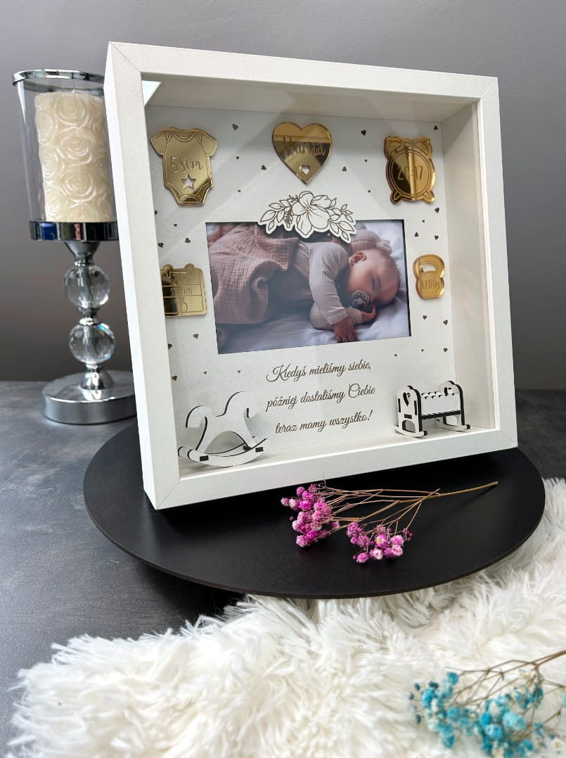 Głęboka Biała Ramka 3D to doskonały prezent dla świeżo upieczonych rodziców lub wyjątkowy sposób na uwiecznienie wspomnień o początku życia Twojego dziecka. Niech ta piękna ramka stanie się centralnym punktem dekoracji pokoju dziecięcego lub cudowną ozdobą na rodzinnej półce. Stwórz niezatarte wspomnienia z tą unikalną rameczką!