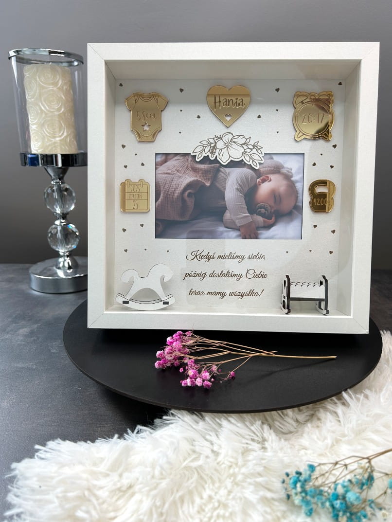 Ramka posiada dedykowane miejsce na zdjęcie Twojego dziecka oraz wyjątkowe elementy z lustrzanej plexi w kolorze złotym. To właśnie na tych złotych detalach znajdują się istotne informacje o narodzinach - imię dziecka, wzrost, godzina, data oraz waga, co czyni ją nie tylko piękną dekoracją, ale także cenną pamiątką.