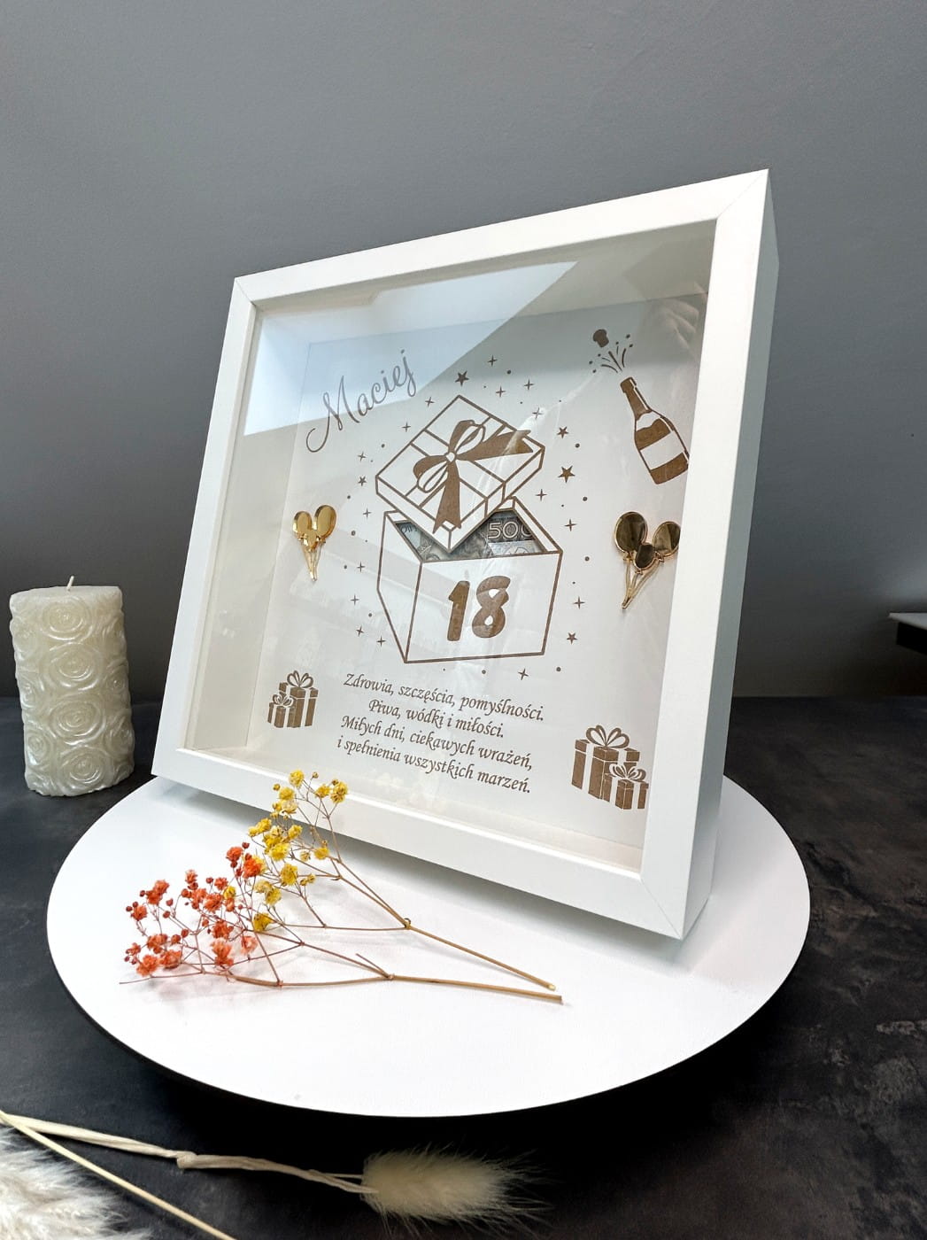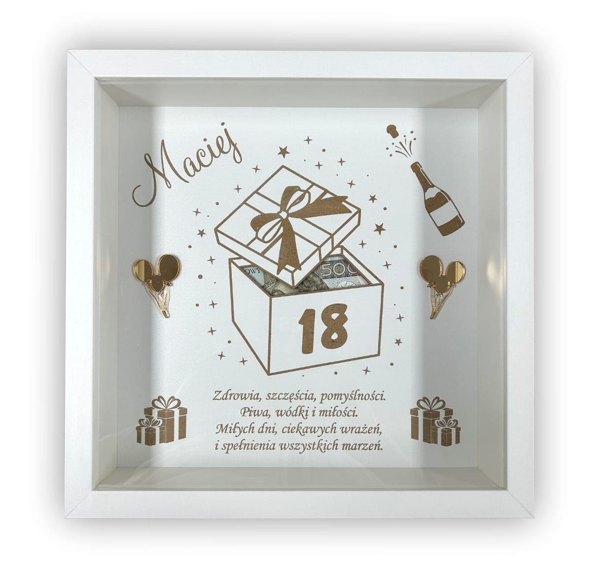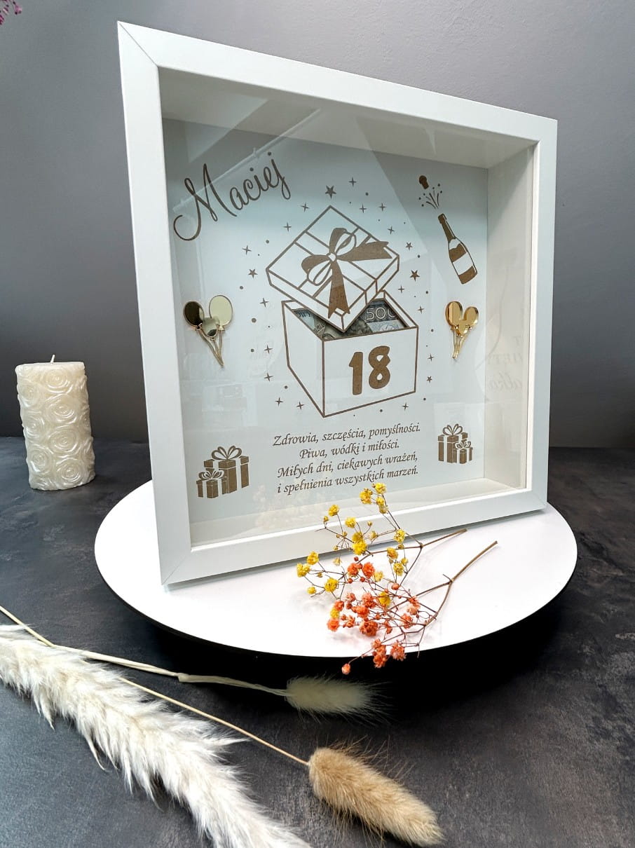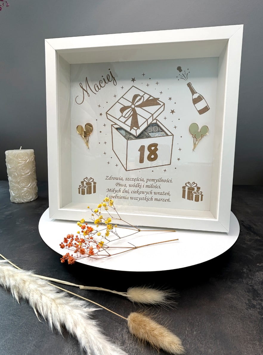 Ramka została zaprojektowana z myślą o tych, którzy pragną połączyć praktyczność z oryginalnym designem. Na jej środku umieścimy imię jubilata, co sprawi, że prezent stanie się niepowtarzalny i osobisty. Wewnątrz ramki znajduje się piękna grafika przedstawiająca otwarty prezent, z którego „wyglądają” pieniądze – dzięki czemu obdarowany z pewnością poczuje się wyjątkowo!