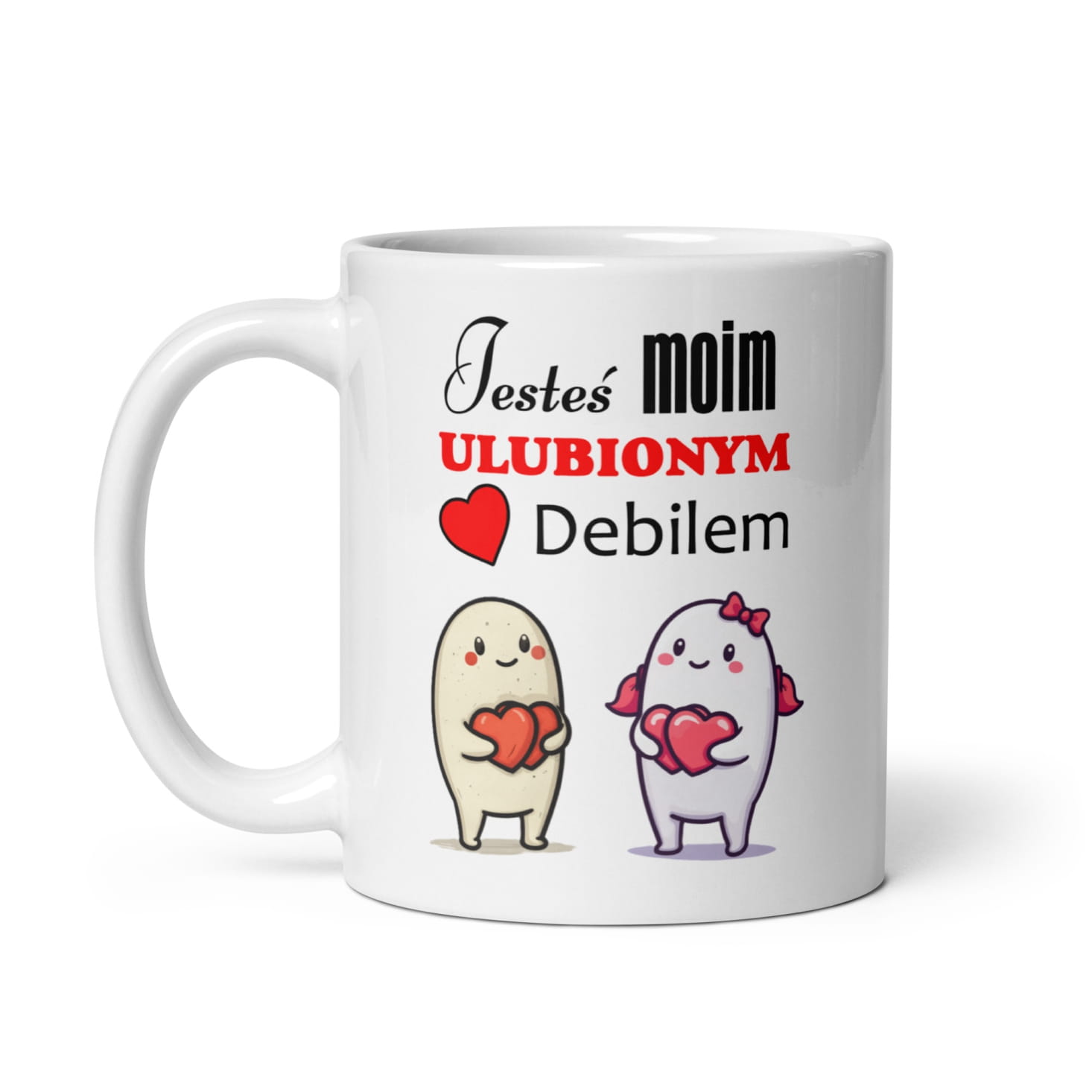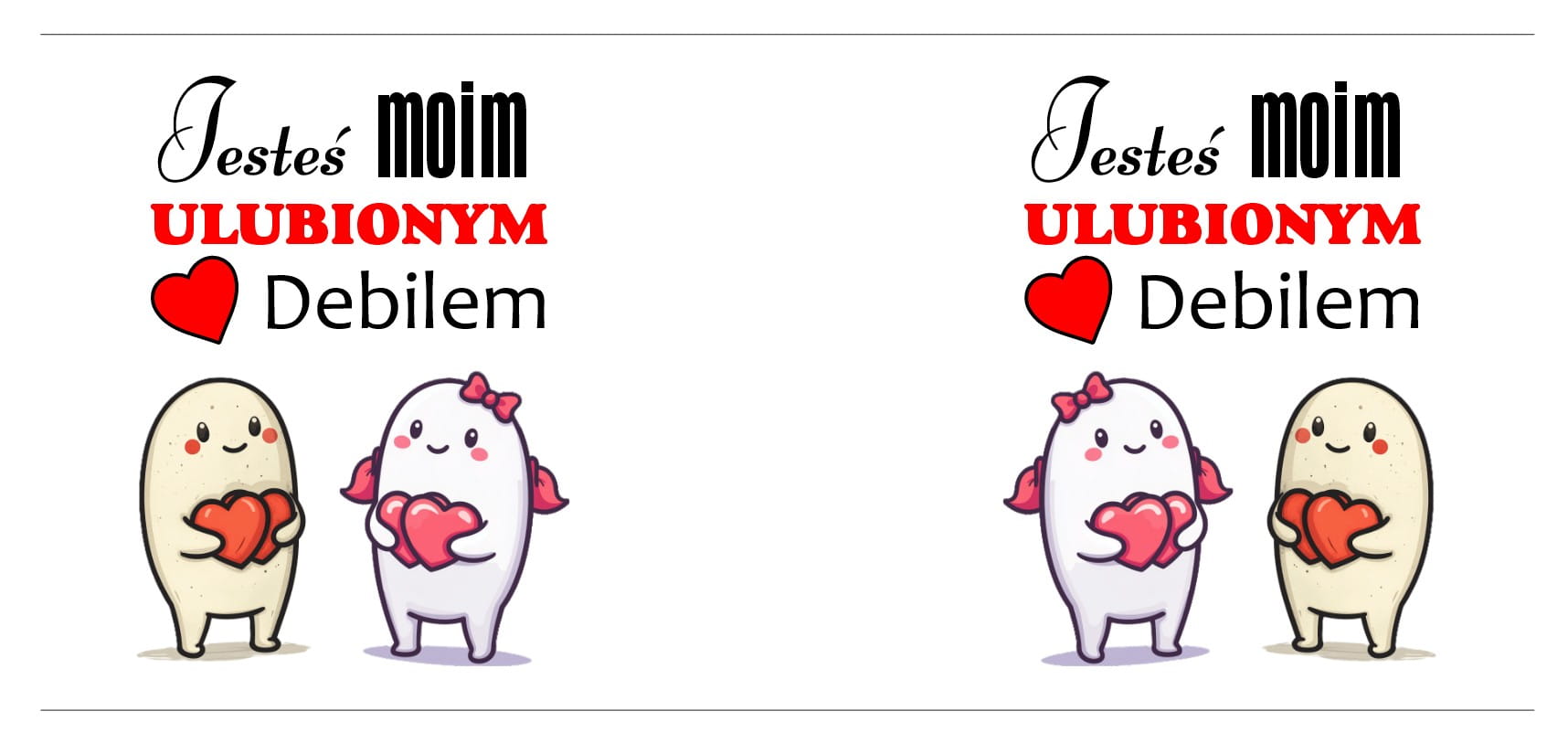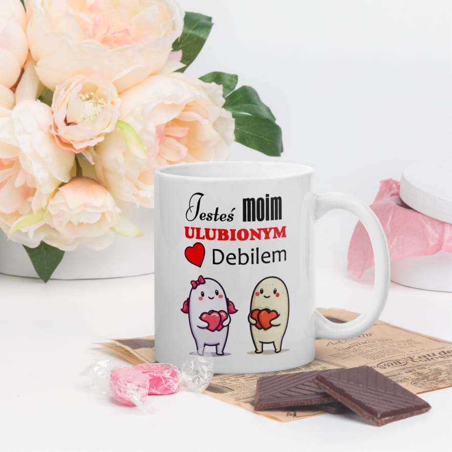 Na kubku znajdują się dwie urocze, rysunkowe postacie trzymające serca, a nad nimi widnieje kultowy już napis: "Jesteś moim ulubionym debilem". To doskonały sposób, aby pokazać bliskiej osobie, że akceptujesz ją dokładnie taką, jaka jest – z całym inwentarzem jej szalonych pomysłów i dziwnych nawyków.