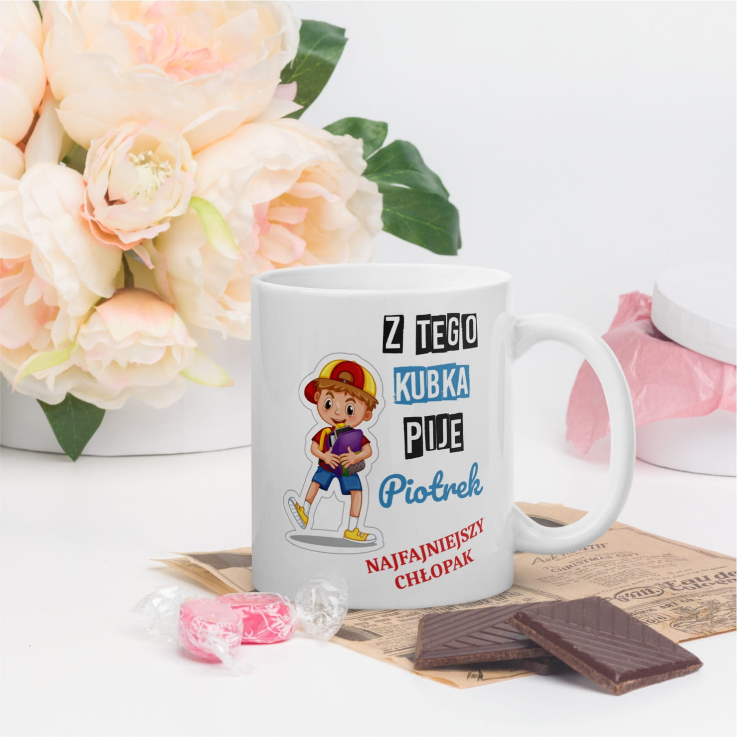 Kubek ceramiczny z uroczą grafiką chłopca, imieniem i inspirującym tekstem "Najfajniejszy Chłopak". Ten produkt jest idealnym prezentem dla każdego wyjątkowego chłopca w Twoim życiu.
