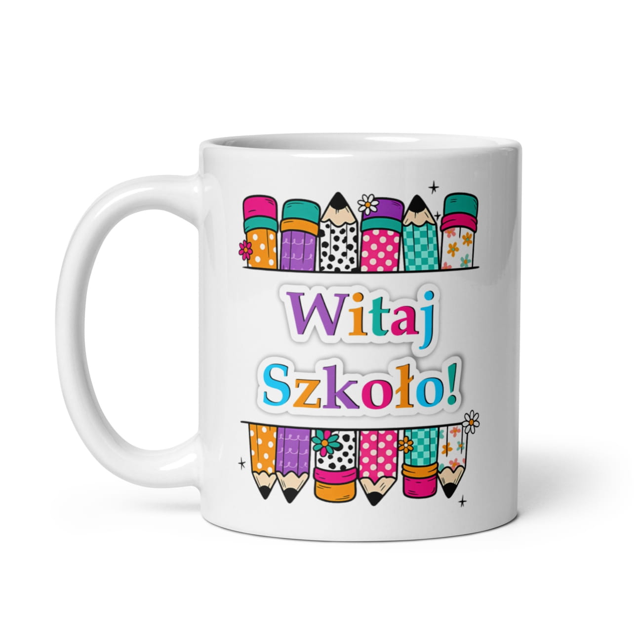 Biały kubek "Witaj Szkoło" z grafiką kolorowych kredek