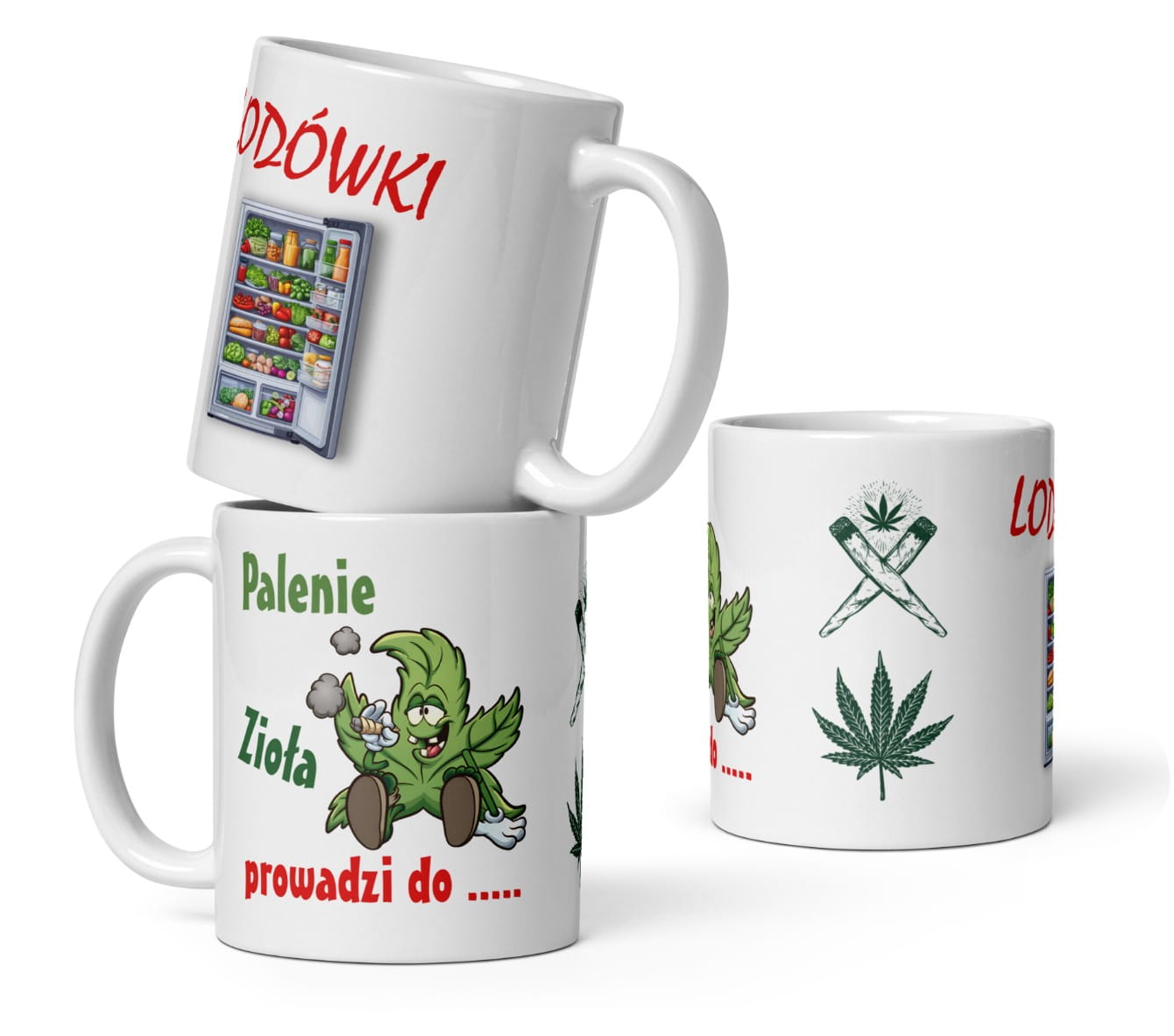 Kubek z zabawnym tekstem, oraz napisem Palenie zioła prowadzi do..... Lodówki