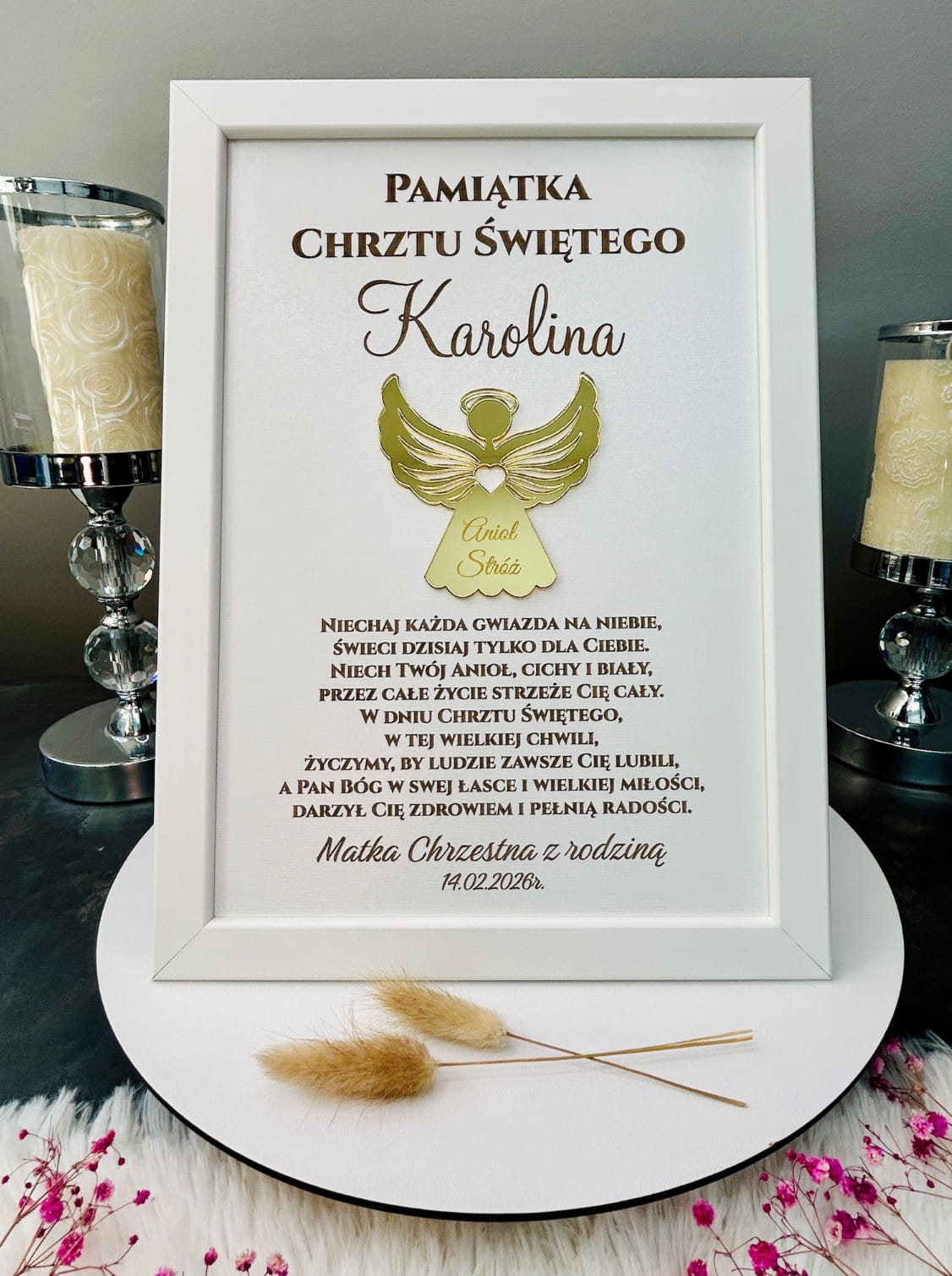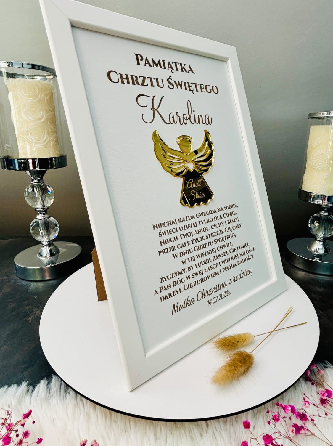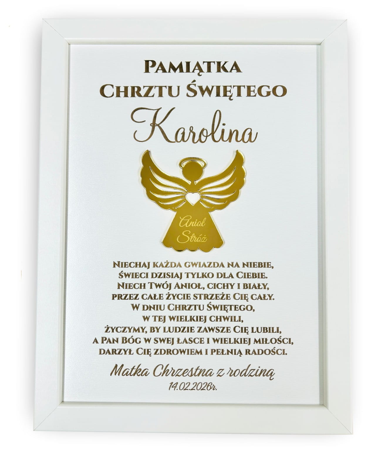 Szukasz wyjątkowego i trwałego prezentu na Chrzest Święty? Nasza personalizowana pamiątka w eleganckiej białej ramce to połączenie nowoczesnego designu z głęboką symboliką. Centralnym punktem jest aniołek wykonany ze złotego pleksi z efektem lustra, który nadaje całości luksusowego charakteru 3D.
