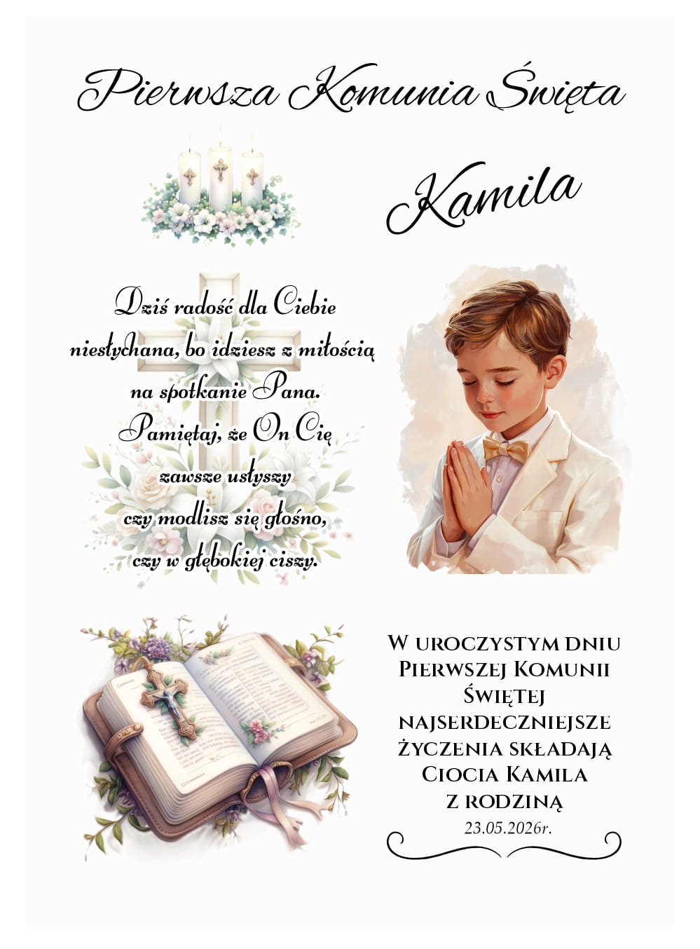 Pełna Personalizacja: Na projekcie umieścimy imię dziecka, datę uroczystości oraz Twój własny podpis (np. "Ciocia Kamila z Rodziną").