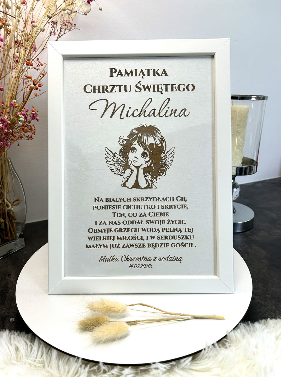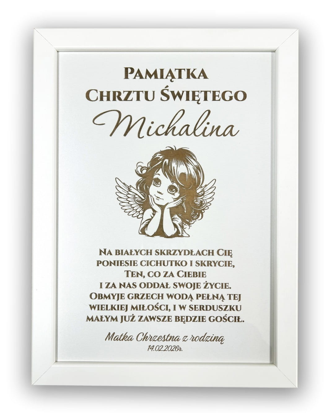 Personalizowana Pamiątka Chrztu Świętego w Białej Ramie – Ilustracja Aniołka dla Dziewczynki