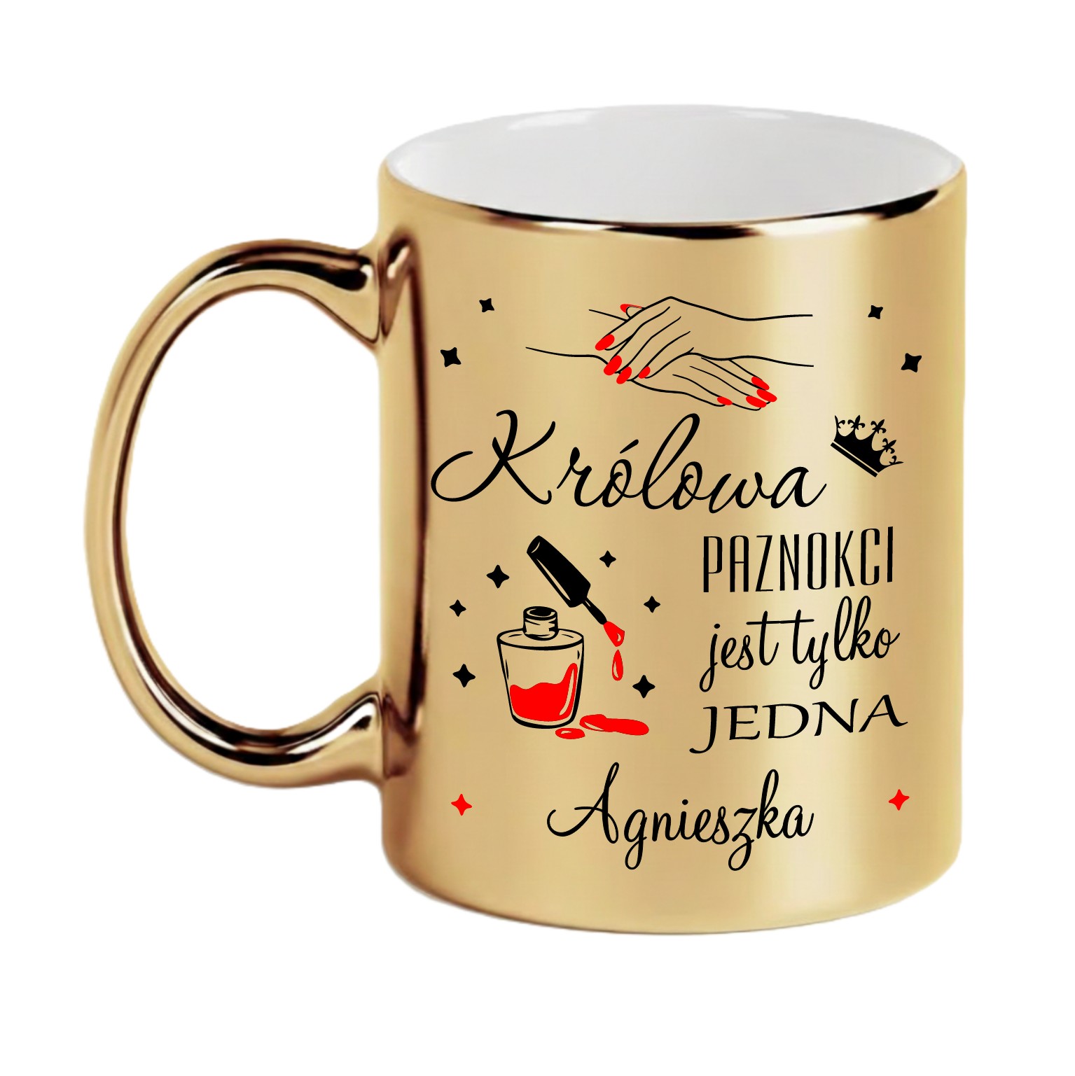 Oto elegancki, złoty kubek lustrzany, który przyciąga wzrok i dodaje blasku każdej przerwie na kawę. Wyjątkowy design z napisem "Królowa paznokci jest tylko jedna" oraz personalizacja Twoim imieniem sprawiają, że jest to produkt jedyny w swoim rodzaju.