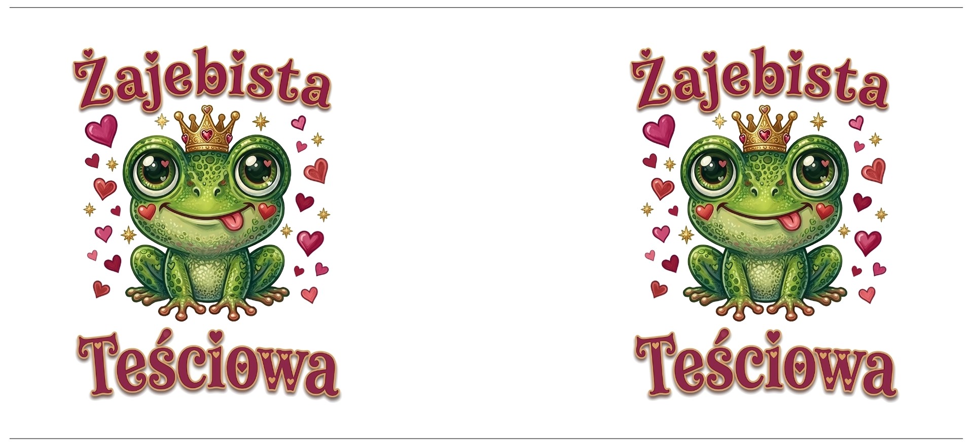 Wyjątkowy Design: Autorska grafika słodkiej żabki w złotej koronie, otoczonej serduszkami. Napis „Żajebista Teściowa” to komplement podany w zabawny i nowoczesny sposób.