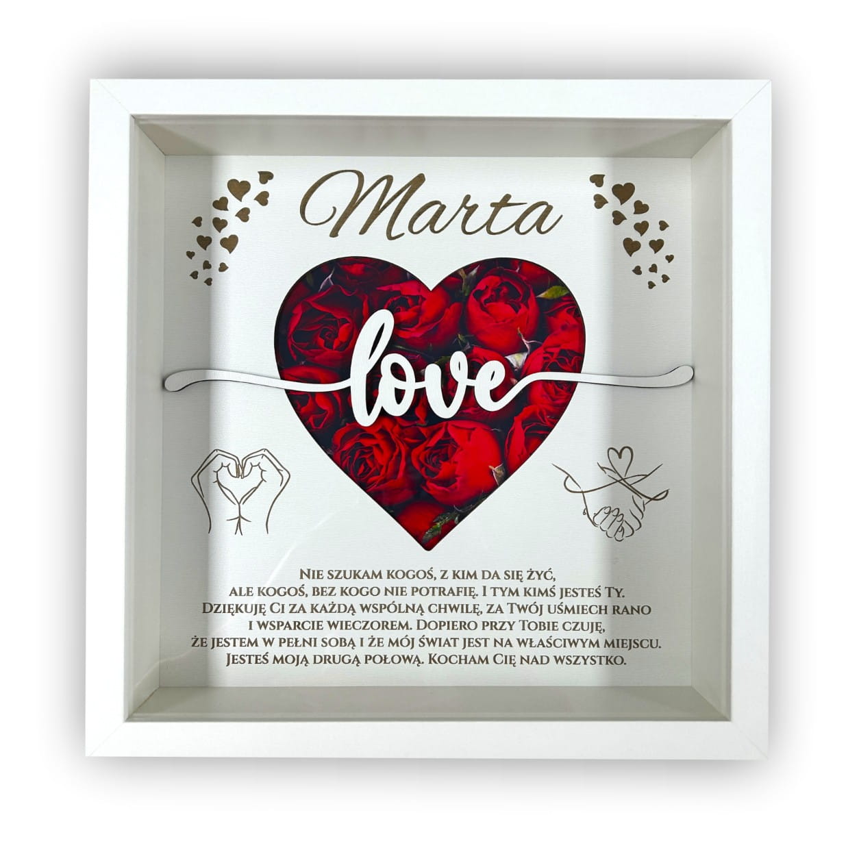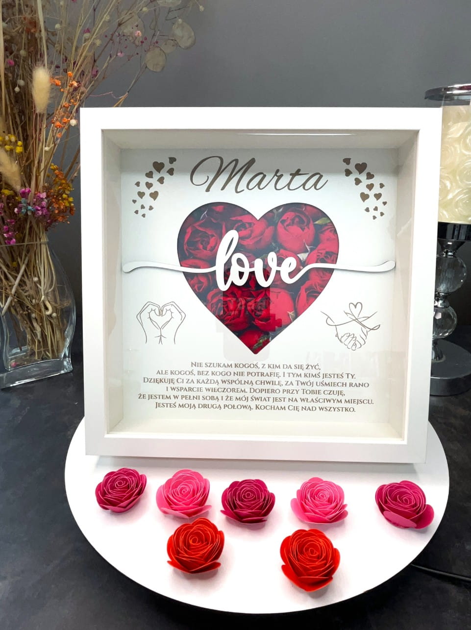 Pełna Personalizacja: Na górze ramki umieścimy imię Twojej drugiej połówki, co czyni prezent unikatowym i stworzonym wyłącznie dla niej.