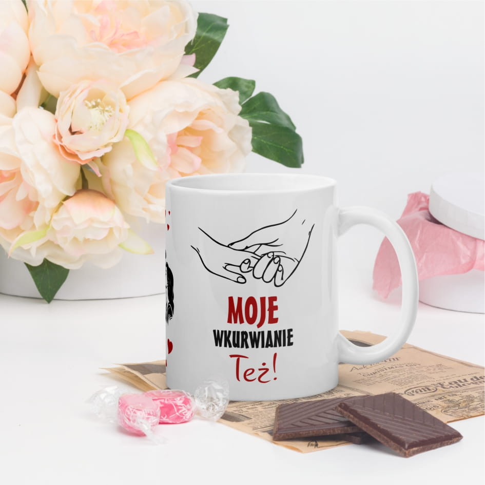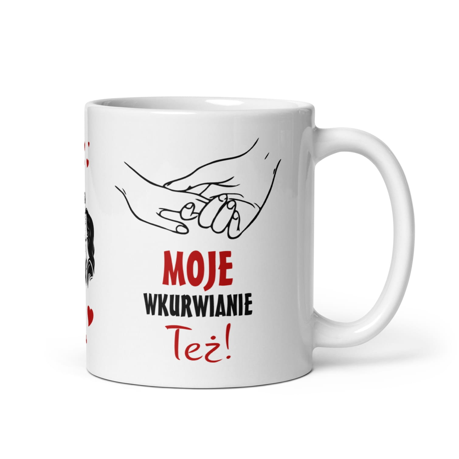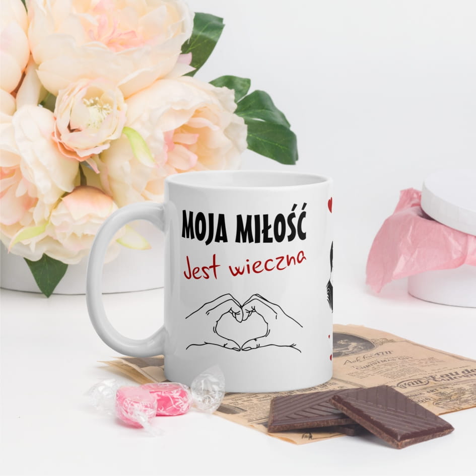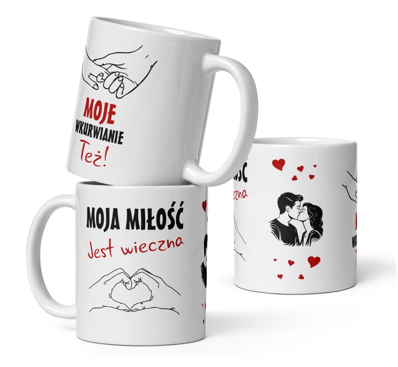 Śmieszny kubek z napisem Moja miłość jest Wieczna - Moje wk**wianie Też. Kubek walentynkowy