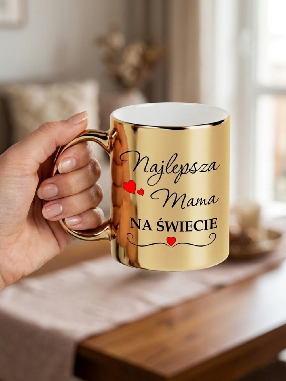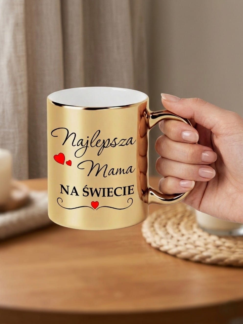 Wyjątkowy Design: Piękna złota powłoka z trwałym, czarnym nadrukiem "Najlepsza Mama na Świecie" oraz subtelnymi czerwonymi serduszkami.