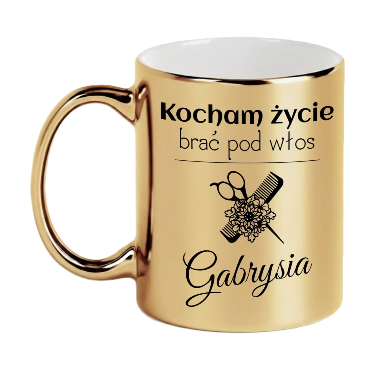 Złoty Kubek Personalizowany dla Fryzjerki – "Kocham życie brać pod włos" – Prezent z Imieniem