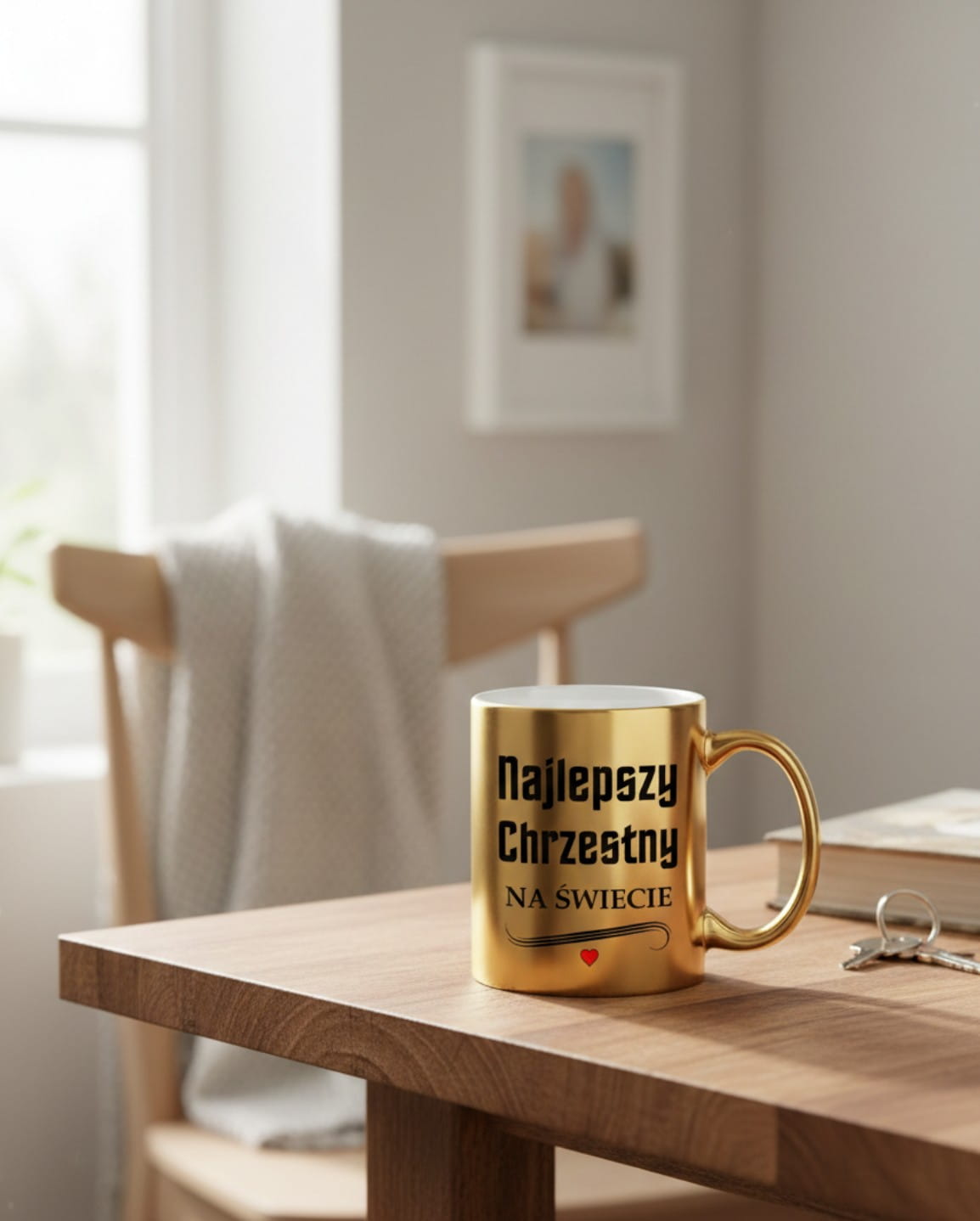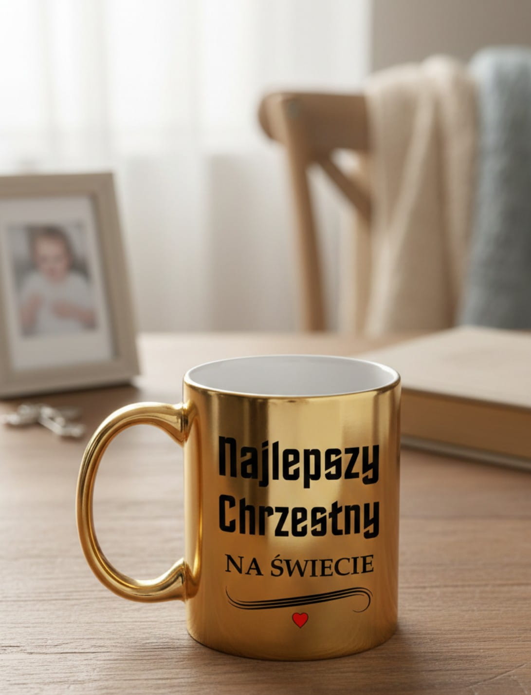 Wyjątkowy Design: Napis "Najlepszy Chrzestny na Świecie" z subtelnym czerwonym sercem wykonany jest trwałą metodą, odporną na ścieranie.