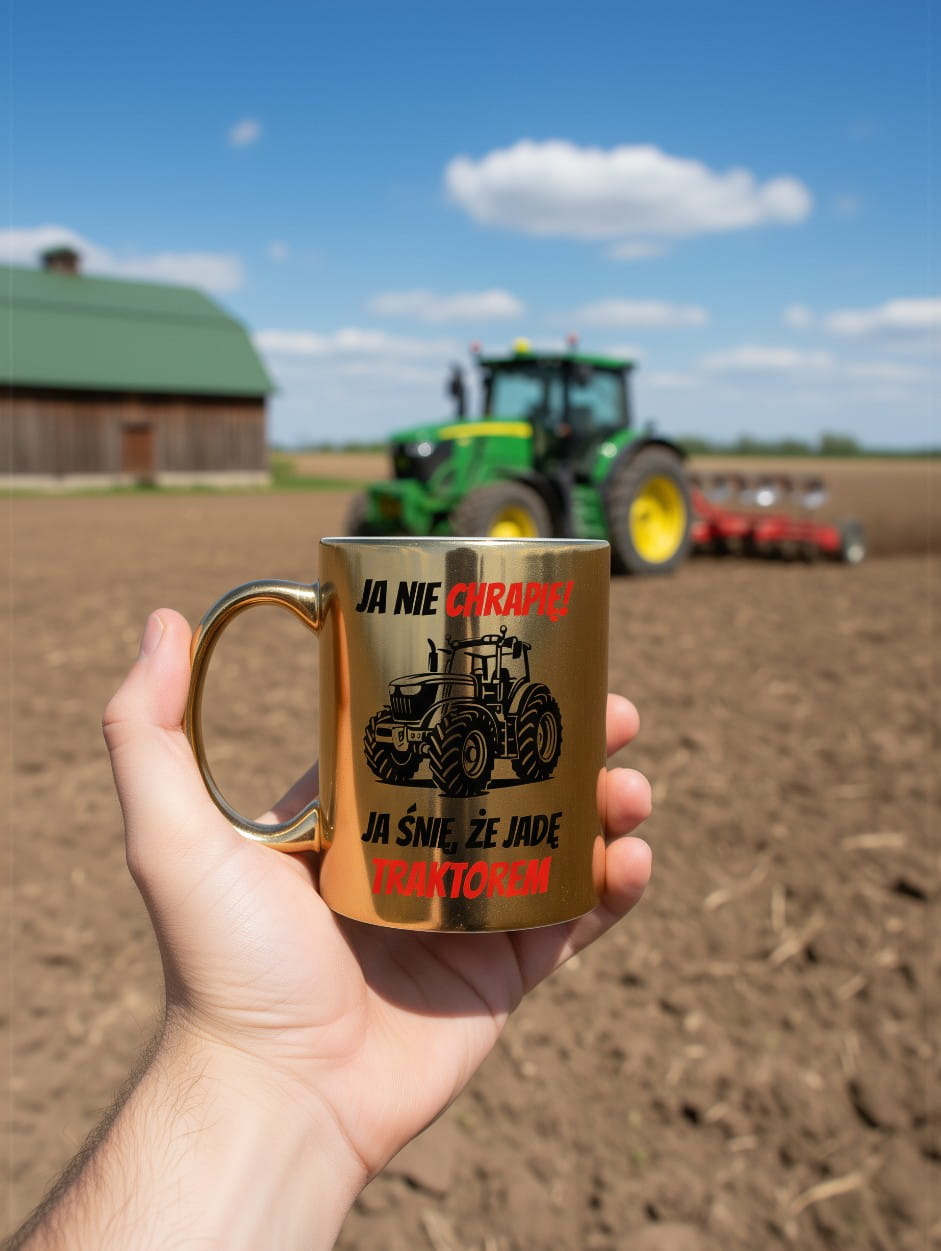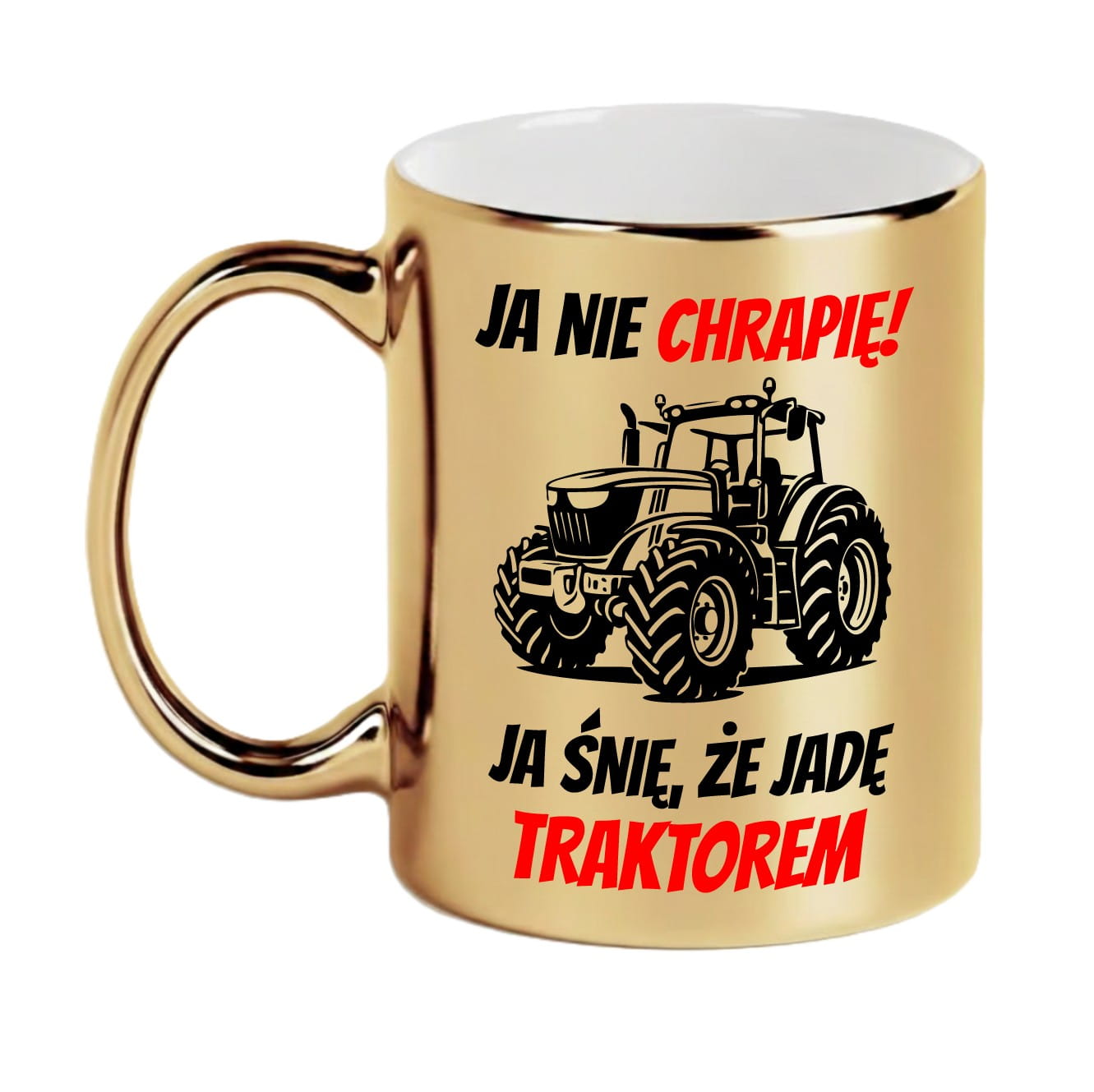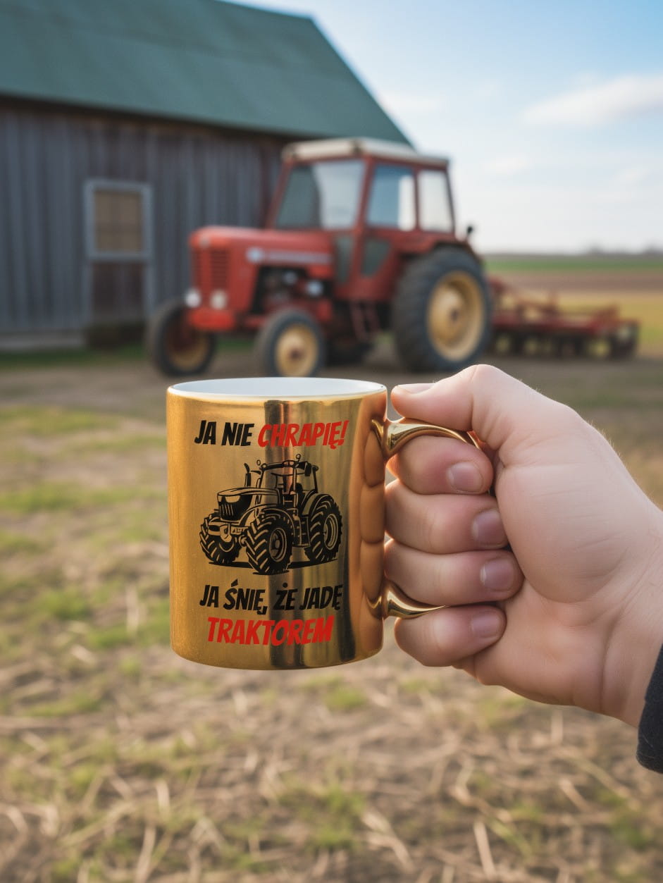 Szukasz prezentu, który wywoła salwy śmiechu i jednocześnie zachwyci elegancją? Ten złoty kubek to idealne połączenie dystansu do siebie z luksusowym wykończeniem. Napis "Ja nie chrapię, ja śnię, że jadę traktorem" to kultowe hasło każdego fana rolnictwa i ciężkiego sprzętu, który nocami "pracuje na pełnych obrotach".
